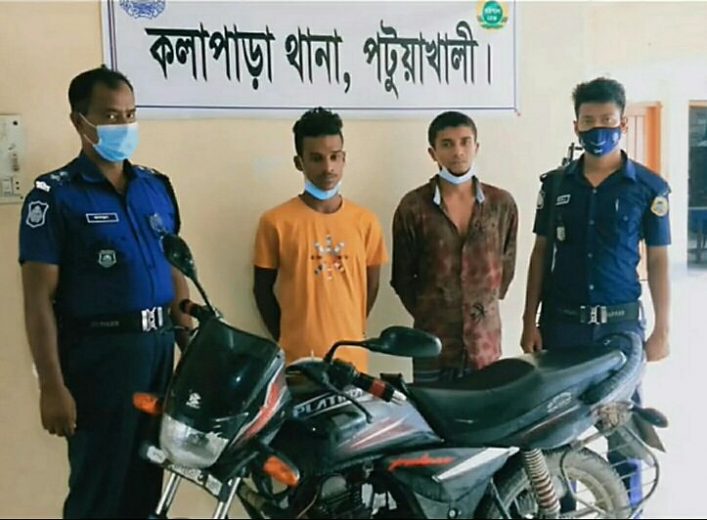 কলাপাড়া (পটুয়াখালী) প্রতিনিধিঃ কলাপাড়ায় মটোরসাইকেল ছিনতাইয়ের দায়ে রাকিব (২২) ও মনির (২৫) নামের দুই পেশাদার ছিনতাইকারীকে আটক করেছে পুলিশ। সোমবার মধ্য রাতে পার্শ্ববর্তী আমতলী উপজেলার টেপুরা গ্রাম থেকে রাকিবকে আটক করা হয়। এসময় তাদের কাছ থেকে ছিনতাই হওয়া মোটরসাইকেলটি উদ্ধার করা হয়। পরে রাকিবের দেয়া তথ্যমতে মঙ্গলবার সকালে দশমিনা উপজেলার আলীপুরা গ্রাম থেকে মনিরকে আটক করা হয়।